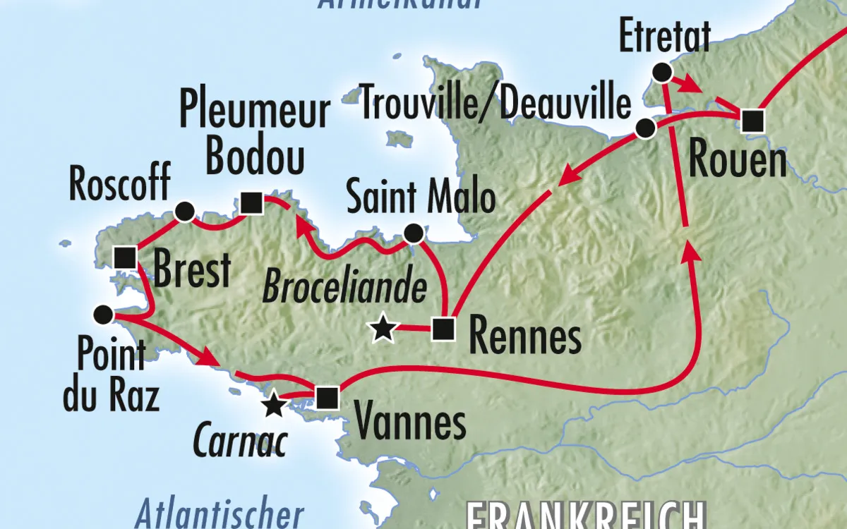 9. Tag: Wir verlassen Vannes und reisen an die Alabasterküste nach Étretat. Hier haben Sie Zeit für einen Bummel durch den wunderschön direkt am Atlantik gelegenen Ort. Zur Übernachtung werden wir bei Rouen erwartet.